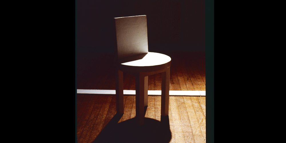 image: The chair exhibited in the exhibition was one from Floor Plan: Spilt Milk (1990) which is, ostensibly, a circe/square (circular seat and squire back). |